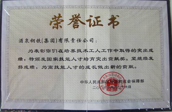 酒鋼集團(tuán)榮獲國家技能人才培育突出貢獻(xiàn)獎(jiǎng)